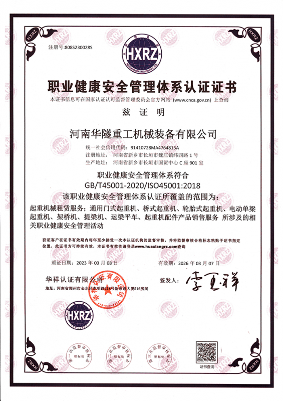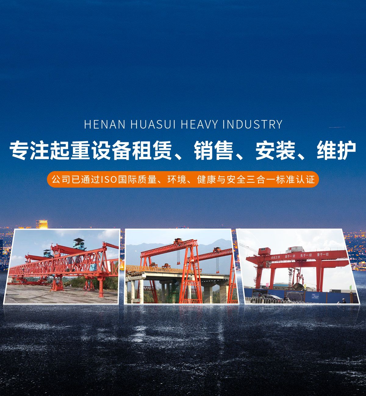 河南華隧重工機械裝備有限公司主要從事通用門式起重機、橋式起重機、電動單梁起重機,輪胎式起重機、架橋機、提梁機、遠梁平車、鋼絲繩電動萌蘆、卷揚機、起重配件制造、銷售:起重機械租賃、安裝和維修,起重設備園收,機械設備維修,鋼結構工程承包,橋梁工程及技術咨淘服務,銷售五金制品、機電設備:建設工程監理,建設工程設計,各類工程建設活動,建筑勞務分包,建筑物折除作業,施工作業,工程管理服務,土石方工程施工,裝如發運。  公司已通過IS0國際質量、環境、健康與安全三合一標準認證,特種設備制造許可證和特種設備安裝改造維修許可證。擁有完熟的質量管理體系。嚴格的管理制度,強大的生產能力和先進的檢測手段,在保證產品質量的同時,也具備了極強的市場競爭力?! 」緢猿挚萍紕撔聻槔砟?,產品質量為核心,注重信譽,建立了減信可靠、快捷、思速。便利周到的售后服務網絡。  我們擁有的技術專家和技術服務隊伍為客戶提供充善的售前技術支持和全天候的售后服務體系,讓您無后顧之憂,享受一站式的超值服務。  “華隧重工,伴您成功“是華隧重工永遠的宗指,真被的希望與各界朋友攜手并進。共創輝準!